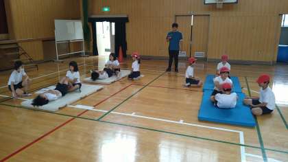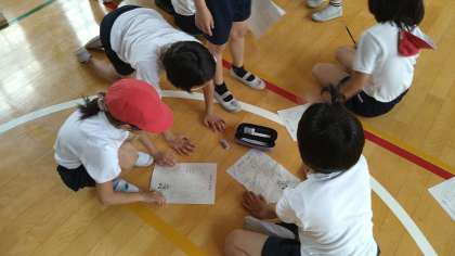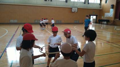今回は上体起こし(腹筋)と握力を計測しています。今日ですべての種目の計測が終わっています。計測が終わったあとは、フープを使ってグループで協力するゲームをしています。