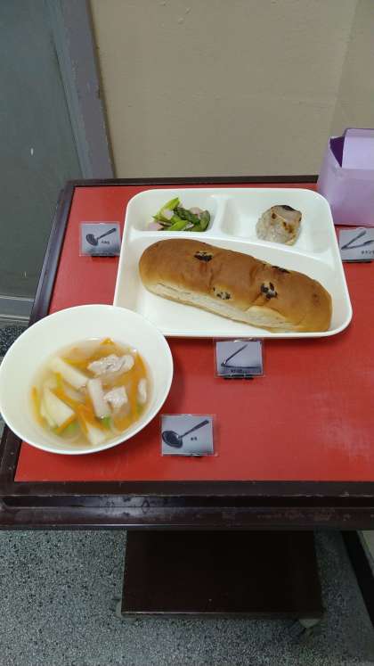 今日の小おかずは「かつおのマリネ焼き(ノンエッグドレッシング)」が提供されています。かつおに塩・こしょう・ノンエッグドレッシングで下味を付け、焼き物機の蒸し焼きモードで調理しています。