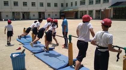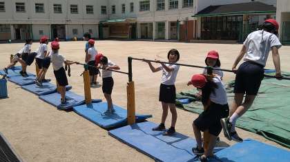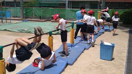 それぞれの子どもたちが自分で挑戦したい技に取り組んでいます。逆上がりに取り組んでいる子どもたちが多いようです。その他にもさまざまな技に挑戦しています。