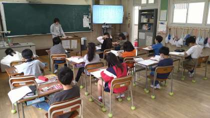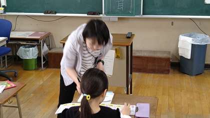 新出漢字「国」と「聞」を練習したあと、物語文の学習をしています。第1場面の主人公の「えっちゃん」が帽子をもらう場面の読み方について考えています。