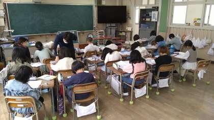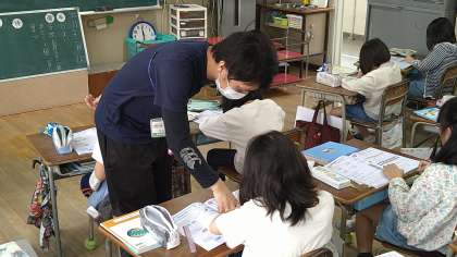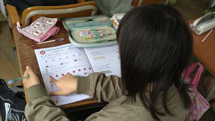 「分けられる数はいくつ」「1人分はいくつ」というわり算の単元の問題に取り組んでいます。困ったところは指導者に聞きながら解き進めています。