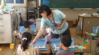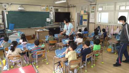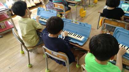 じゃんけん列車を楽しんだあと、鍵盤ハーモニカの練習をしています。どの指でどの音階を押さえるかの基本的な練習を繰り返しおこなっています。