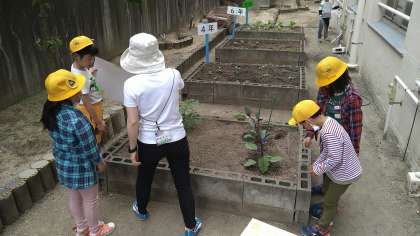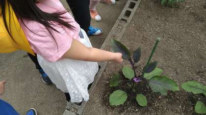 校舎の南側の学習園で育てている「きゅうり」「なす」「ミニトマト」「オクラ」「ピーマン」を観察しています。葉っぱを触って感触の違いに気がついています。