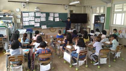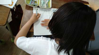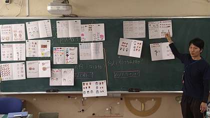 画用紙の片側の左に文章問題、右に式・答えを書いています。もう片側には、その問題を絵で表しています。その画用紙を全員分黒板に貼り、仲間分けをしています。