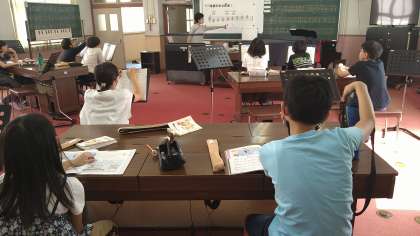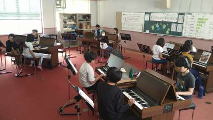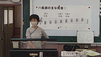 「ドミソ」「ファラド」「シレソ」の3つの和音を「茶色の小びん」の各小節にあわせています。指導者がメロディを弾き、子どもたちが和音を弾いて確認しています。