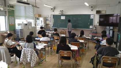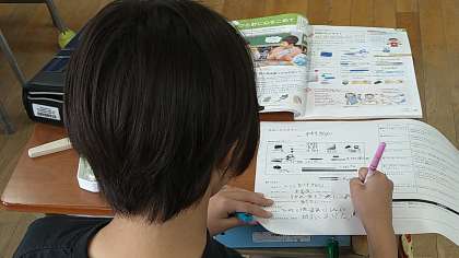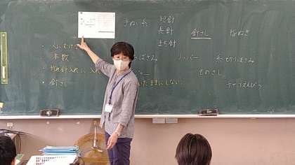 「手ぬいにトライ!」(ワークシート)で針やはさみの使用上の注意点を確認したあと、針に糸をとおしています。