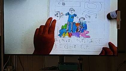 書画カメラを使って大画面モニターに、それぞれがかいたワークシートを映し出しています。校長室やなかよし教室、いきいき教室で発見したことをしっかり発表しています。