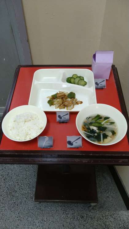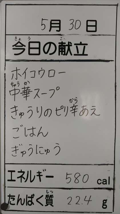 今日も昨日に引き続き中華メニューとなっています。大おかずは「中華スープ」、小おかずは「ホイコウロー」です。ホイコウローは調味料として甜麺醤を使用しています。