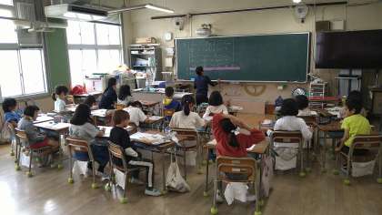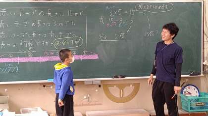 赤いテープの長さは15cmで青いテープは3cmです。赤いテープは青いテープの何倍ですかという問題です。答えは図で表してわかるのですが、式を立てるところで2つの考えが出ています。