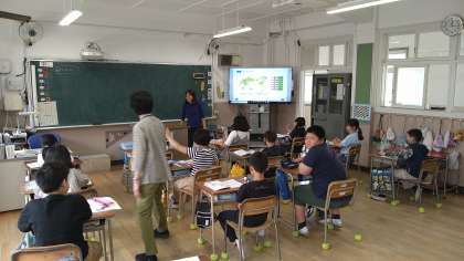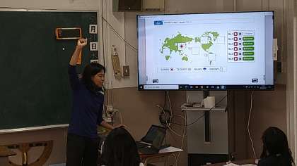 天気に関係する学習です。「SUNNY」「CLOUDY」「RAINY」「SNOWY」の4つの天気について聞き取っています。