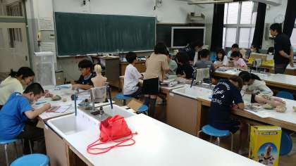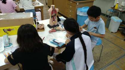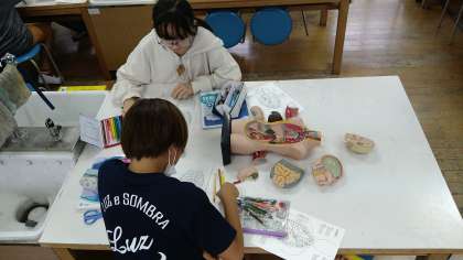 人体模型を使って、体の中(内臓)の様子を観察しています。ワークシートに描かれた臓器を色鉛筆で塗りハサミで切っています。切り取った臓器を、体が描かれたワークシートに重ねて貼りあわせています。
