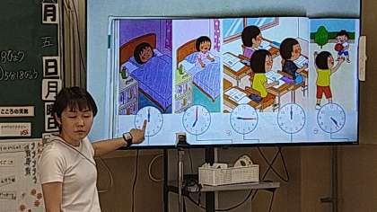1日の生活をえがいた絵を見て時刻の読み方を確認しています。今日は午前と午後について考えています。