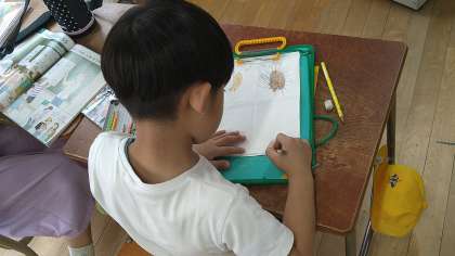 学校の中で、春や夏を見つけに行きました。学習園や体育館裏などでさまざまな動植物を見つけスケッチしました。