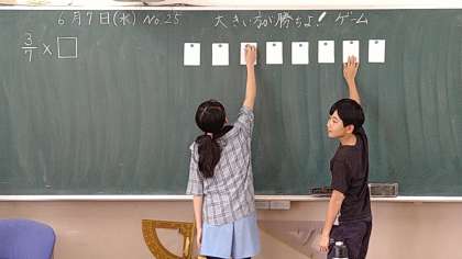 2人が8枚あるカード(数字が書いてある)から1枚ずつ選び、決められたかけられる数にかける問題です。分数?小数や分数?分数などを計算して大きさを比べています。