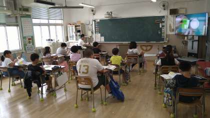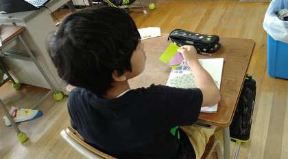 教科書の後ろについている円と正方形の図形を切り取って教材として活用しています。直角(90度)を確認してから学習を進めています。