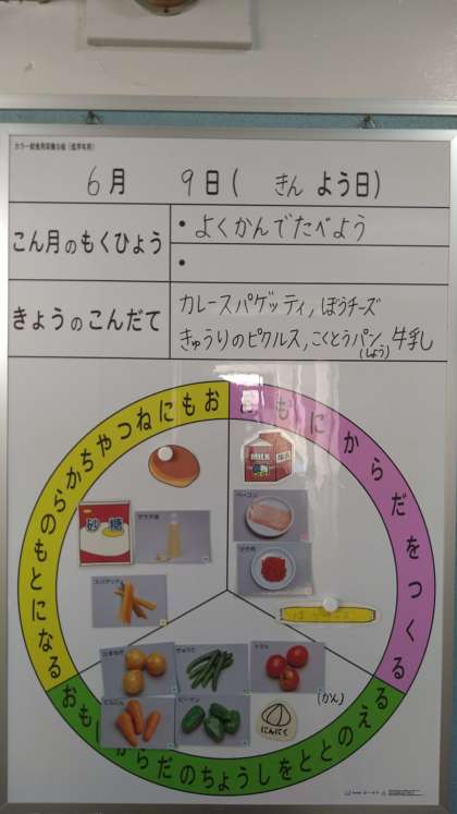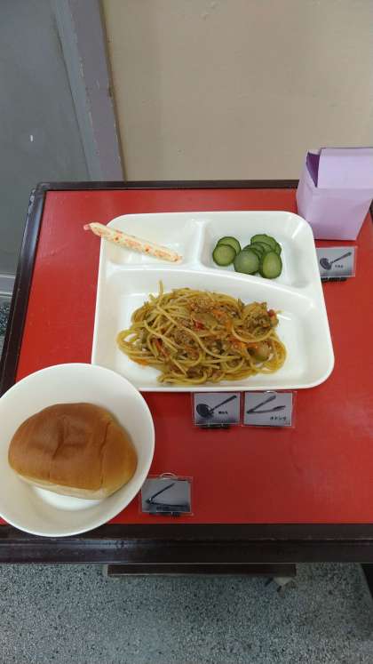 今日はカレースパゲッティと黒糖パンが同時に提供されています。炭水化物が多いメニューの時は、パンの量を減らして調節しています。