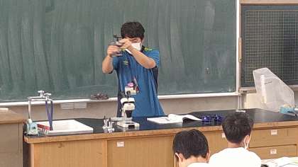教室で「NHK for School」でメダカに関する映像を視聴した後、理科室で学習しています。理科室では、顕微鏡の使い方を学習しています。