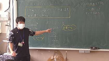 商(答え)が1未満になる小さい数÷大きい数の計算です。さらにわりきれないため、四捨五入も必要となる問題です。ていねいに学習を進めています。