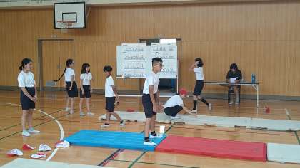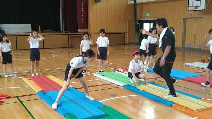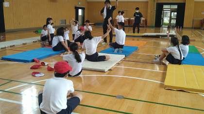 開脚前転に取り組んでいます。股関節が柔らかい児童は比較的簡単に技を成功させています。しっかり開脚できる子どもたちは、開脚の幅を狭める練習をしています。