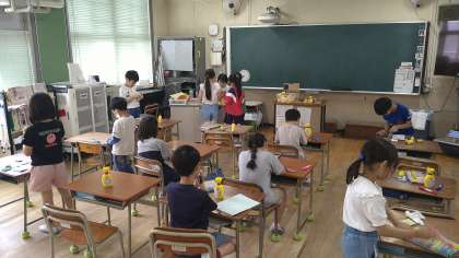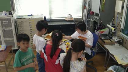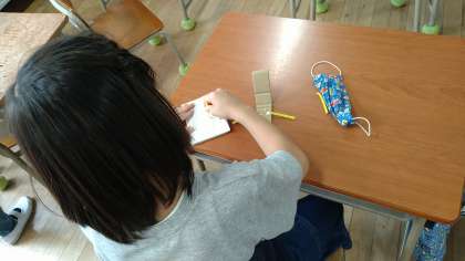 材料は、ダンボール・モール・スパンコール・ボタンなどです。このあと、すきまるくんは物語に登場したり、デジタルカメラで校内の風景写真に登場したりします。