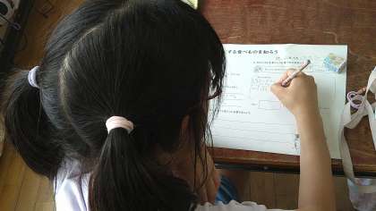 「骨や歯を丈夫にする食べ物を知ろう」というテーマで学習を進めています。「牛乳」「ヨーグルト」「ししゃも」「小松菜」「ひじき」に含まれるカルシウムの量を教材で学習しています。
