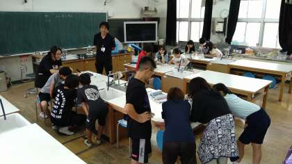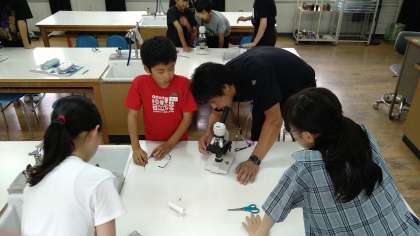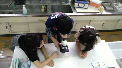 植物の葉の気孔を見るために顕微鏡を使っています。ひと通り手順を確認したあと、グループで協力して観察しています。植物は公園の生えている野草を使っています。