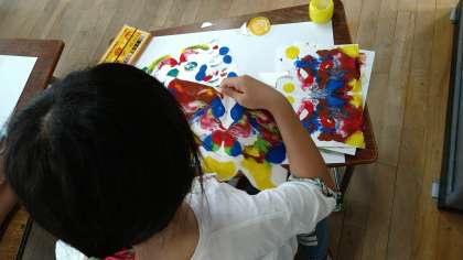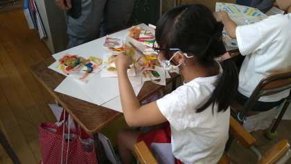 昨日作って乾かしたデカルコマニーを切り取って生きものに見立てています。子どもたちがデカルコマニーにいのちを吹き込んでいます。