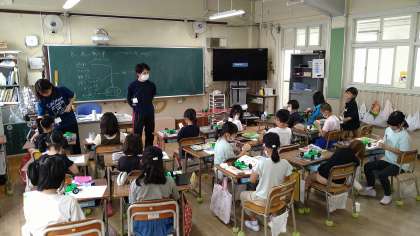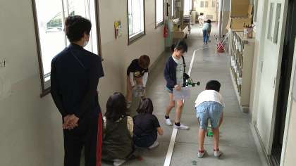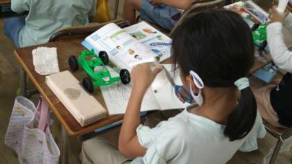 実験キットの車と紙コップを使って風を受けて走る車を作っています。作っては教室の後や廊下を走らせて試しています。