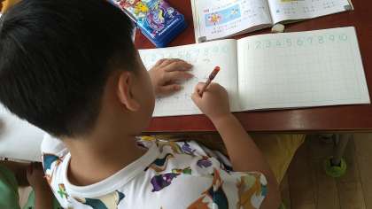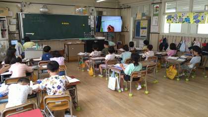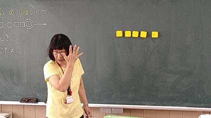 車が5台とまっていて、1台出ていくとのこりは何台になりますかという問題に取り組んでいます。ブロックを使って視覚でもわかるように進めています。