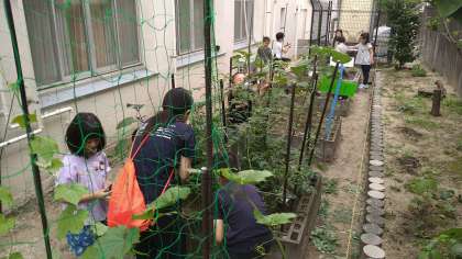 日々のお世話をしっかりとおこなっており、その成果が少しずつあらわれています。今日は、きゅうり・なす・ピーマン・ミニトマトを収穫できています。