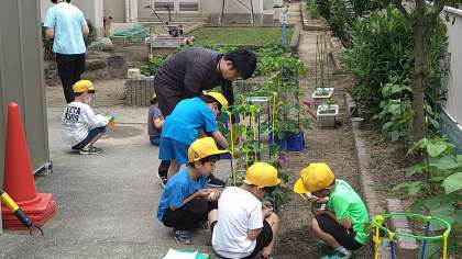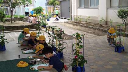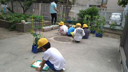 植木鉢の上の方までツルがのび、つぼみが付き始めたり、花が咲き始めたりしています。赤紫色や青紫色の花が大きく開いている鉢もあります。