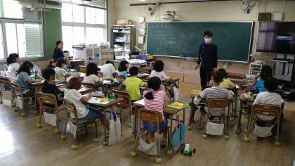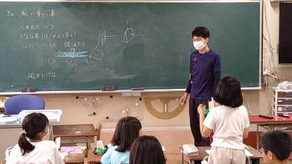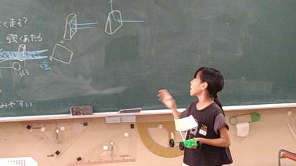 前回の学習で紙コップを帆に見立てて、風で進む車を作りました。どのように紙コップを加工すればよく進むについてわかったことを発表しています。