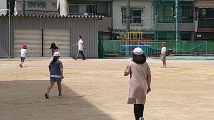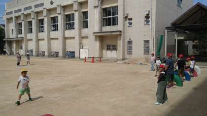 教室での活動のあと、運動場で「色おに」をしています。一番初めの色の指定は「紫色」です。タイヤに集まっています。