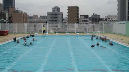 体育館屋上のプールで水泳の学習をしています。