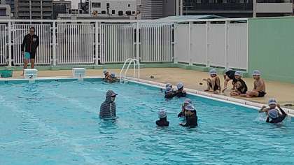 低学年(1・2年)はプールでの水遊びがメインの活動になります。水の中を歩いたり、顔をつけたりしています。