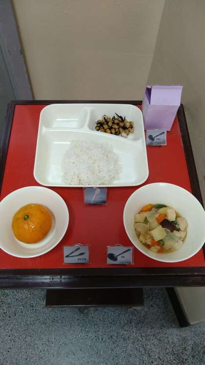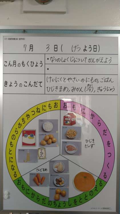 7月初めての給食です。小おかずで「ひじき豆」が提供されています。苦手な子どもたちが多い大豆を60分間熱湯でもどし、でんぷん粉をまぶして油で揚げて、甘辛く味をつけます。子どもたちがよく食べる豆料理に大変身します。