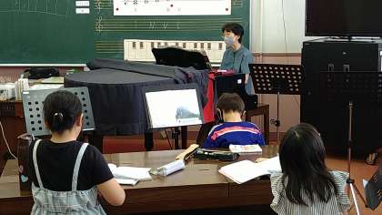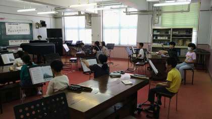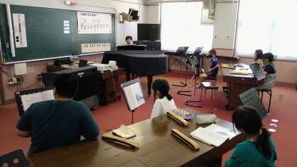 おなかに手を当てて息継ぎの仕方を練習しています。「スー」とタイミングよく息を吸うブレスを使って歌う練習をしています。
