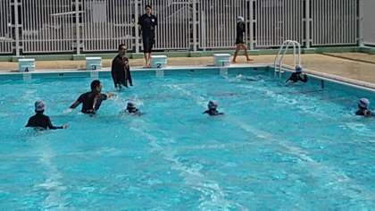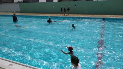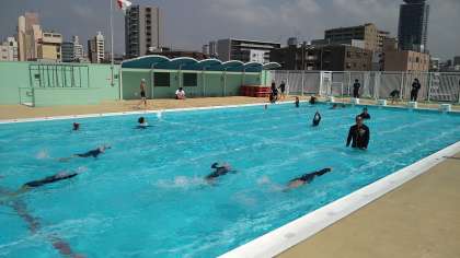屋上プールでプール水泳(浮く・泳ぐ)の学習をしています。