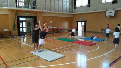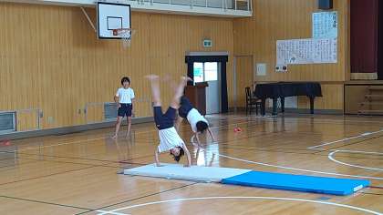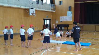 取り組んでいるのは、側方倒立回転跳び(側転)と側方倒立回転跳び半分捻り(ロンダート)です。初めに倒立に取り組み、側転・ロンダートの順に挑戦しています。