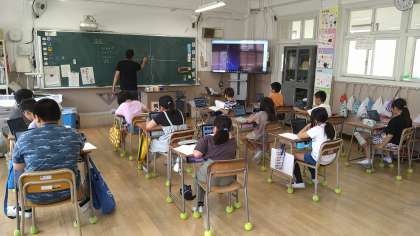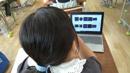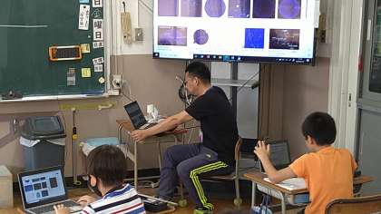 タブレット端末を使って春夏秋冬の星座について調べ、ノートにその星座の絵をかいています。春は「しし座」「おおぐま座」「うみへび座」などをかいています。