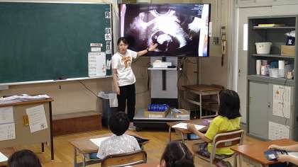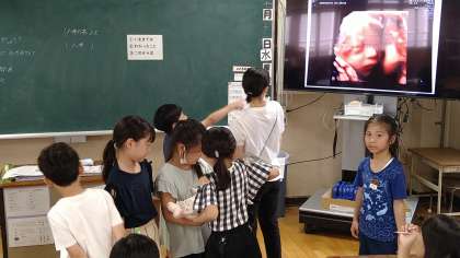 2年は「おへそのひみつ」というテーマで、赤ちゃんにとってとても重要であることを学習しています。また、3学期の生活科の学習にもつなげていきます。ゲストとして約3kgの赤ちゃん人形も登場しています。