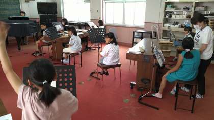 楽しいポケット歌集と教科書の中から子どもたちのリクエストにそって歌っています。「あわてんぼうのサンタクロース」「小さな世界」「ドレミの歌」などがリクエストされています。