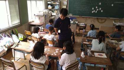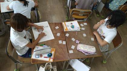 「0」から「9」の10枚のカードから5枚を引き、引いた順に左から並べて5桁の数にして大きさを比べて勝敗を決めています。10000より大きさ数について楽しんで学習しています。