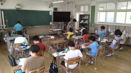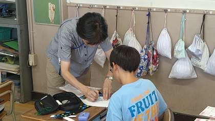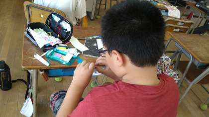 自分で選んだ2色のフェルトを使って小物を作っています。2色は「黒と白」「水色と白」「青と水色」「エメラルドグリーンと水色」などがあります。さまざまな形の小物を作っています。