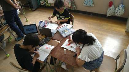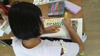 8月と9月に誕生日を迎える(た)子どもたちと2学期から転入してきた7月生まれの児童のお誕生日会になります。それぞれの児童が工夫してプレゼントを制作しています。