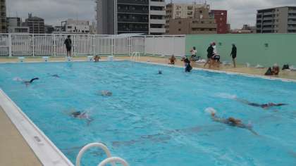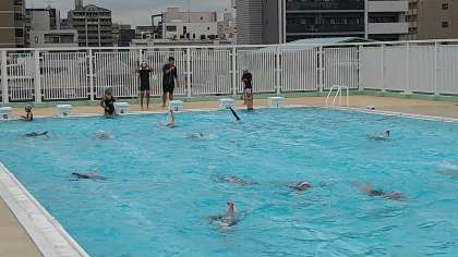 水中で服を脱ぐことはかなり難しかったようです。最後に、服を脱いで水着になって25mを泳いでいます。水を得た魚のようにスイスイと泳ぐ子どもたちがたくさんいます。