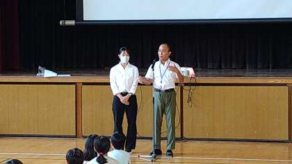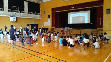 児童集会の前に本日より1週間、現場実習に来られた「大阪市教師養成講座」の受講生を子どもたちに紹介しています。