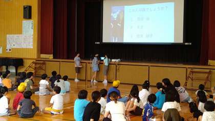児童集会は、たてわり班でアニメのキャラクタークイズをしています。クイズは3択クイズとなっており、集会委員会が考えています。
