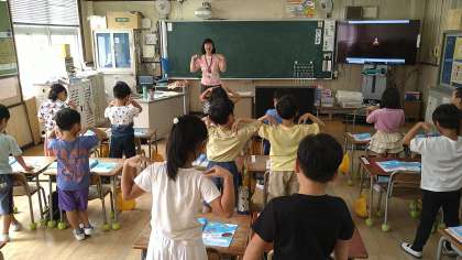 みんなのポケット歌集から「」を歌っています。次に教科書の「どれみのキャンディー」を歌に合わせて体を動かしています。動きは子どもたちが工夫して考えています。