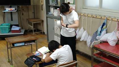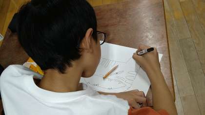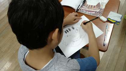 八つ切の半分の画用紙に、ねずみかねこをかいています。鉛筆で下がきをして油性ペンでなぞり、色鉛筆で色を塗って仕上げています。